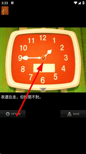 3、发现墙上时钟表,還在走但時間不對,点击红色箭头指向的时钟表盘,尝试调整时间或从中挖掘解谜信息。