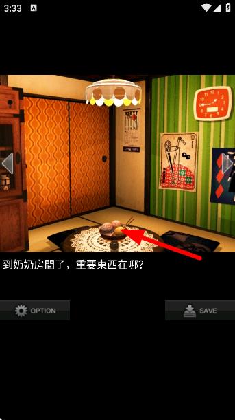 1、留意场景中的物品,根据提示寻找重要东西,先查看红色箭头指向的圆形桌台区域,可能藏有关键线索或道具。