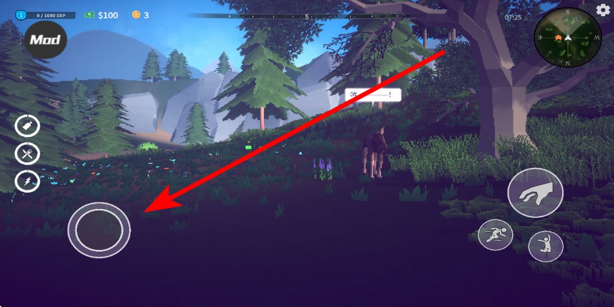 2、操控角色移动,进入游戏场景后,通过点击屏幕左下方的虚拟方向键,灵活控制角色在野外移动,去探索周边森林环境寻找有用的资源求生。