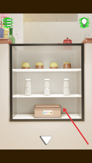 2、探索场景发现带玻璃门的冰箱,打开后聚焦底层带彩钮木盒,细观按钮颜色、布局,留存开启盒子的解谜线索。