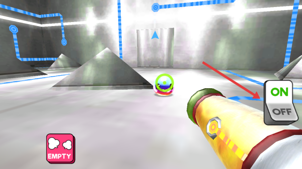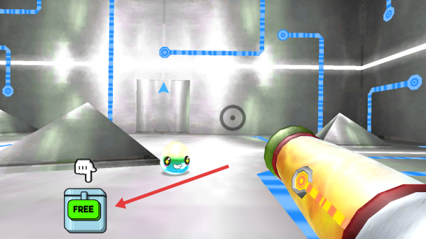 1、科技风房间场景,点击FREE按钮领取粉色道具,武器瞄准彩色小生物,开启互动挑战流程。