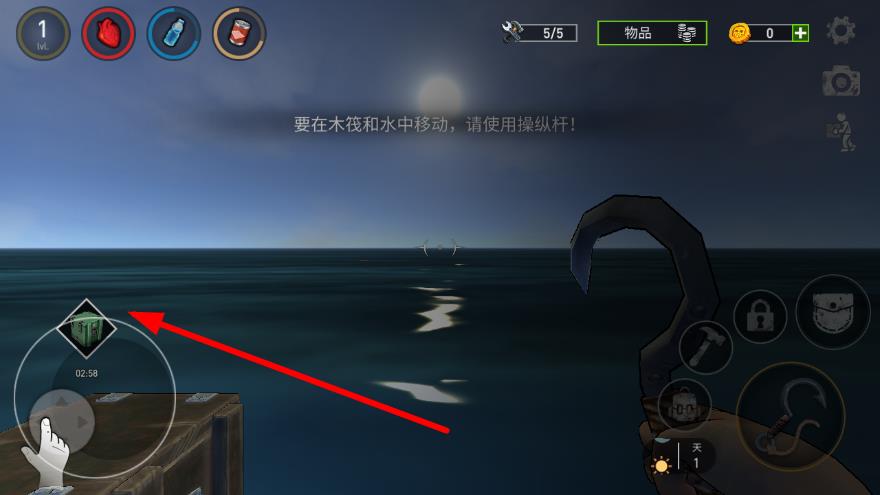 1、进入游戏后,从漂浮在海洋上的初始木筏开始,收集周围的漂浮物如木板、塑料瓶等,利用基础材料加固木筏,制作简单的工具如鱼竿、斧头。