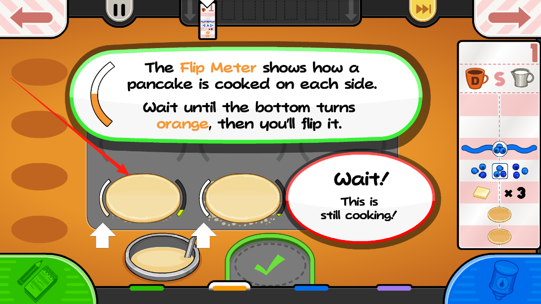 1、观察翻转计量表,判断煎饼底部的烹饪状态,等待底部变为橙色时执行翻面动作,依据计量提示把控煎饼熟度,完成烹饪步骤。