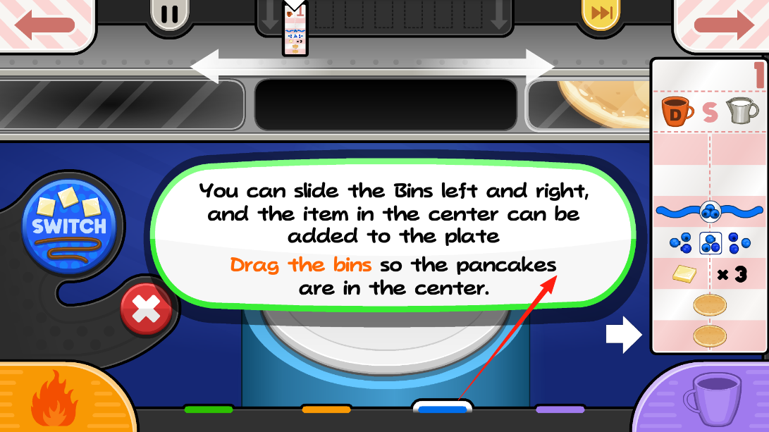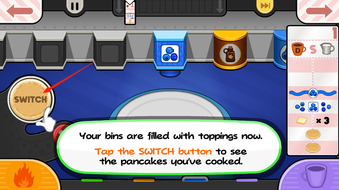 2、点击SWITCH按钮,切换至已烹饪煎饼的查看界面,此时料箱填充配料为后续装饰流程铺路,体验界面切换的交互设计。