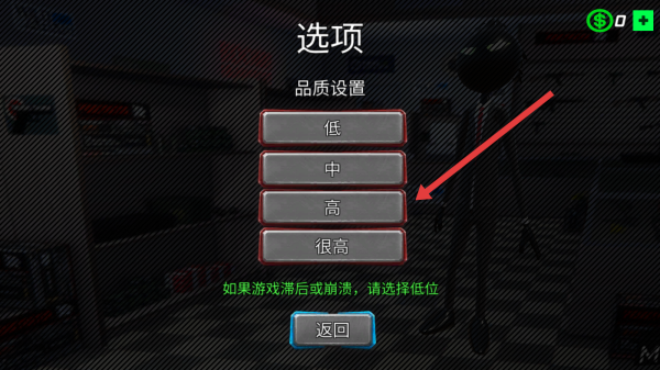 1、在游戏选项界面,点击高品质设置按钮,虽提示滞后或崩溃可选低位,仍可尝试高画质来提升视觉体验,完成画面质量设定。