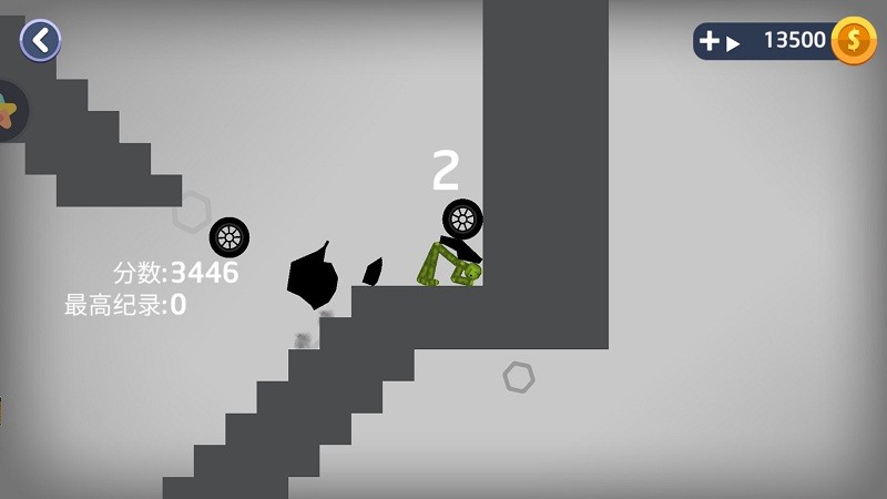 1、点开陡梯挑战模式,让火柴人沿斜坡或者楼梯滚落,利用地形台阶、陡坡多次增加撞击,引起多部位摔倒。