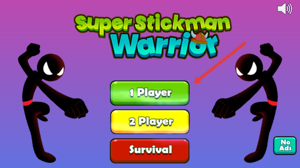 1、在Super-Stickman-Warrior主界面,点击绿色1-Player按钮,进入单人模式的角色与AI对战配置界面,开启单挑对决流程。