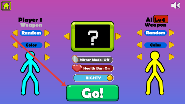 2、在单人对战设置页,选定Player-1武器、颜色等参数,确认Mirror-Mode和Health-Bar状态后,点击绿色Go!按钮,正式进入战斗场景。