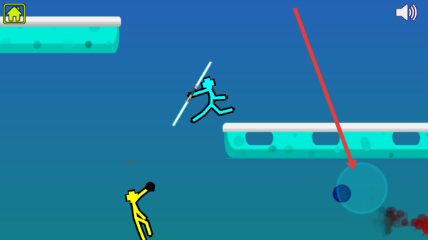 3、战斗中操控蓝色火柴人,利用武器攻击黄色AI对手,留意场景右侧可互动的蓝色球体,借助攻击或拾取道具提升战斗优势,击败敌人。