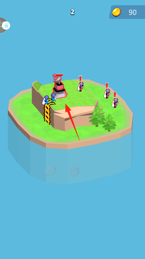1、关卡1,操控岛屿上的白色士兵,沿红箭头进攻敌方建筑,利用初始金币,可招募或升级士兵,在水上的蓝色士兵需登岛参战。