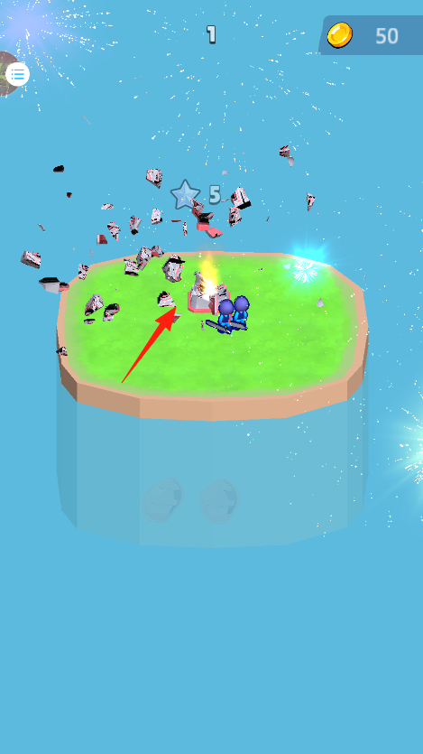 3、战斗阶段,蓝色士兵成功摧毁敌方建筑,产生爆炸特效,获取星星、金币奖励,剩余金币可用于下一轮战斗,清理岛屿残敌,巩固占领区域。