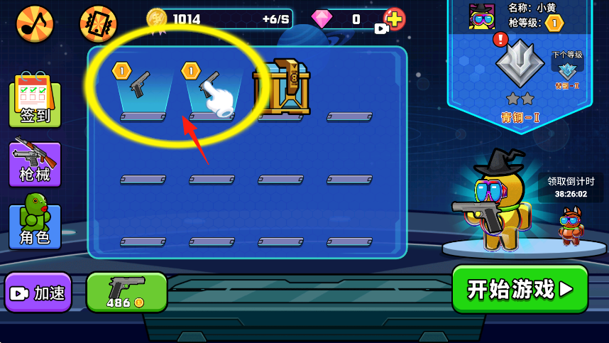 1、在武器界面,点击黄圈标记的1级武器,消耗金币升级,提升武器属性,为战斗做准备,金币可通过战斗、签到获取。