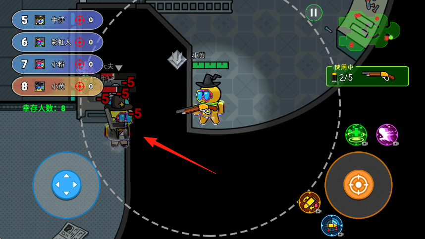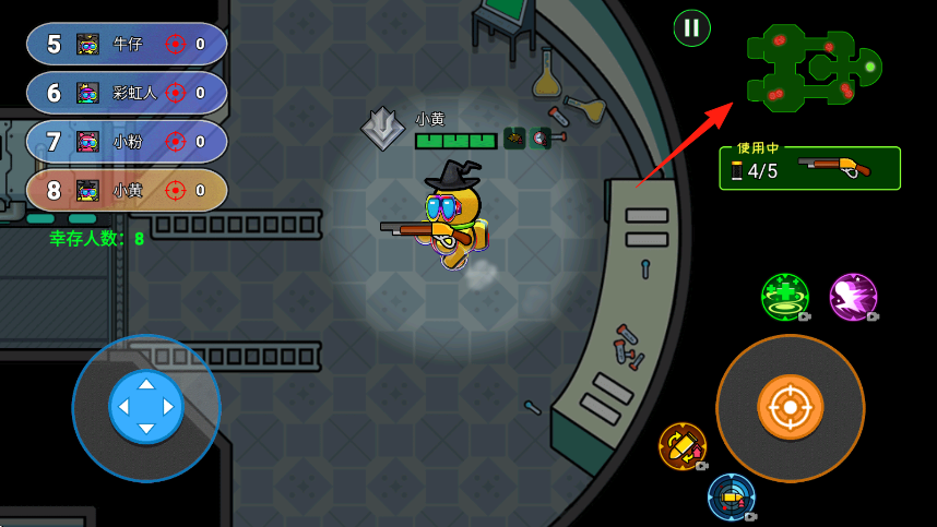 2、进入战斗场景,操控角色小黄,按右上角地图指引,移动探索,武器使用中显示当前装备,遇敌人点击右侧攻击按钮射击。