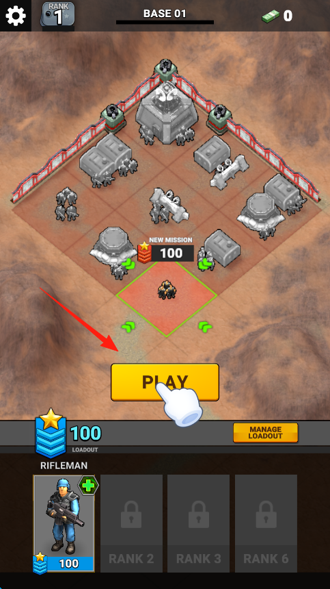 1、进入游戏后,会出现主界面,在BASE01界面,点击黄色PLAY按钮,消耗100资源,开启新任务,进入战斗场景。