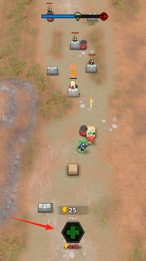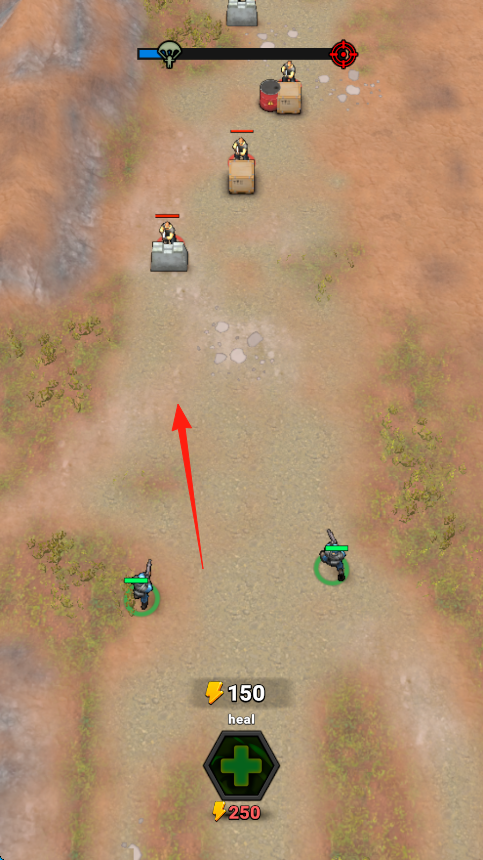 3、当士兵血量低时,点击红箭头指向的heal技能,回复血量,持续推进,摧毁敌方建筑,完成任务,获取奖励,升级基地与兵种。
