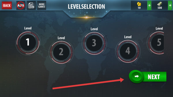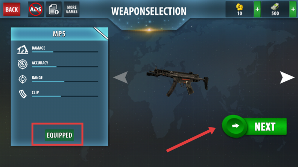 2、在关卡选择界面选定好第一关后,按照指示点击右侧绿色NEXT按钮,进入武器选择界面。