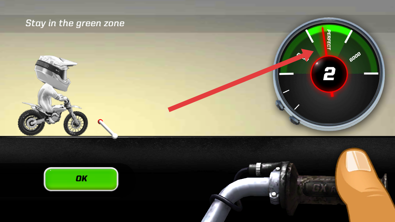 1、点击OK确认,通过点击屏幕控制把手转速,使指针保持在绿色PERFEC的T区域,提升起步速度。