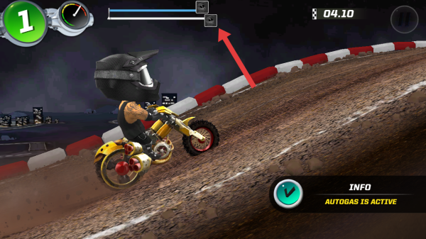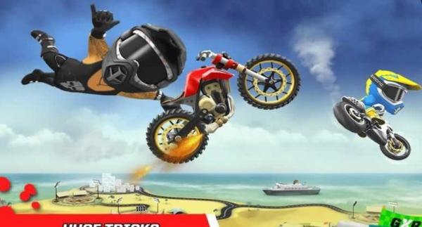 2、操控摩托在泥土赛道行驶,留意上方进度条与计时,利用地形跳跃加速,触发增益,保持领先。