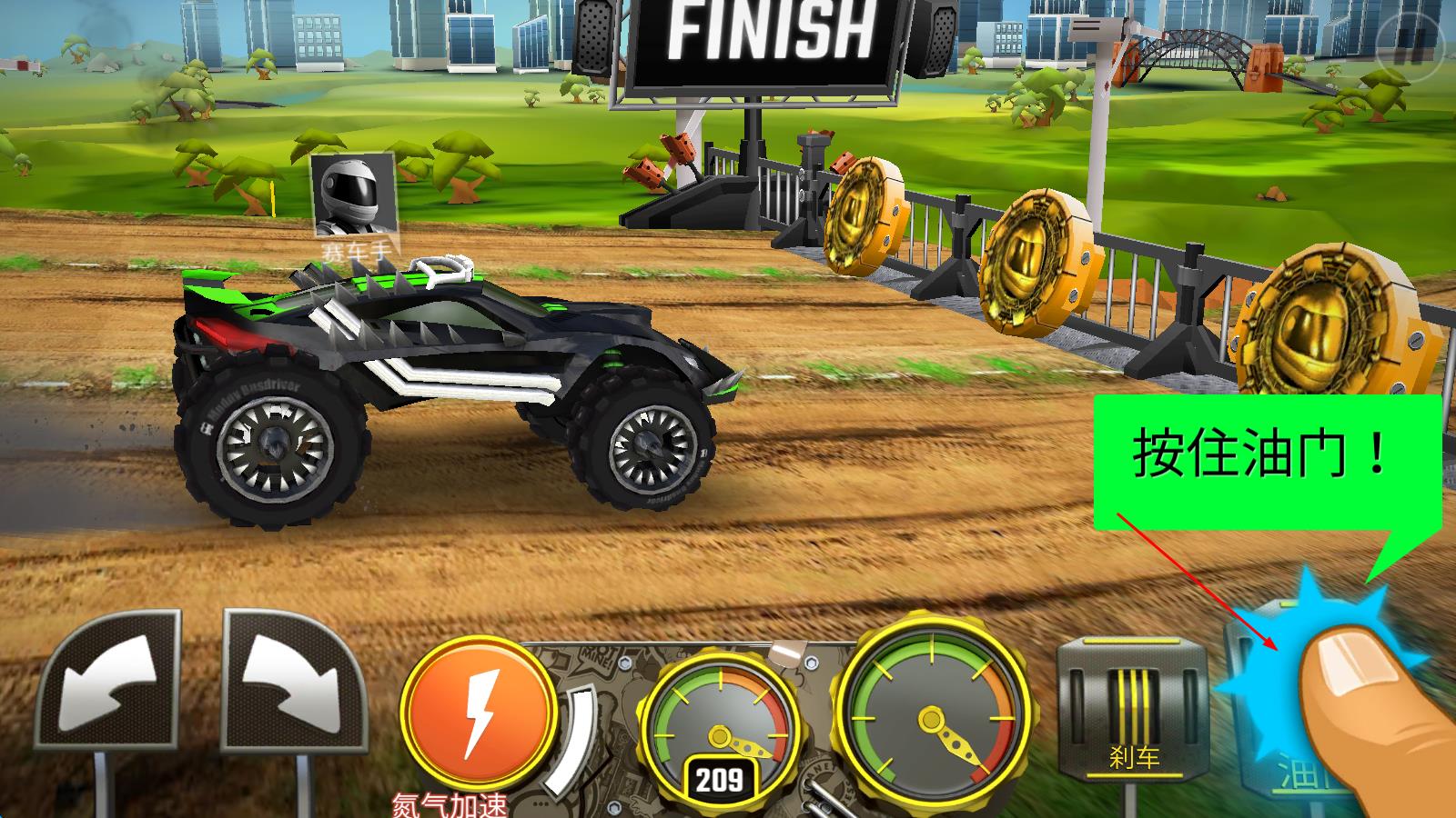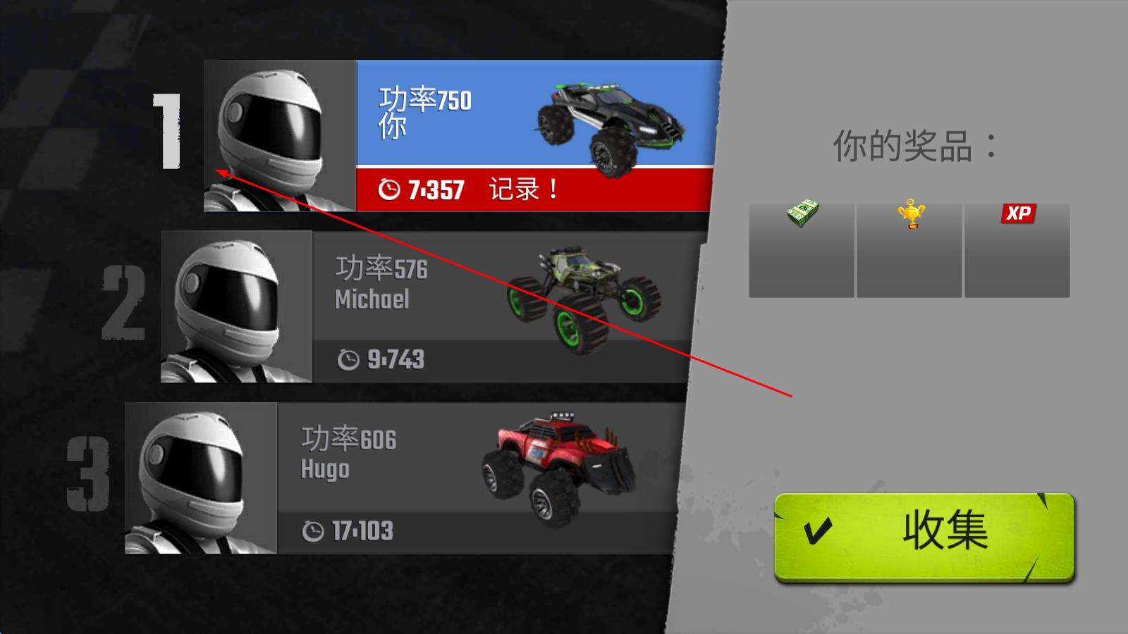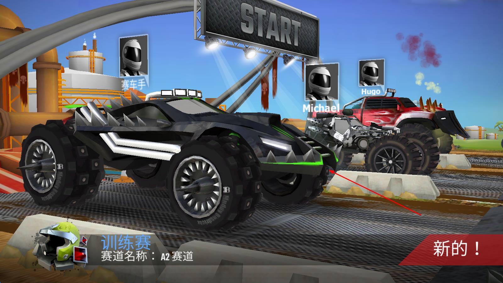 1、进入游戏后,从初始的怪物肌肉车中选择一款,熟悉操作后加入首场竞速比赛,在赛道上努力超越对手,争取更好排名。