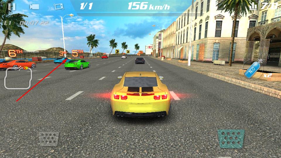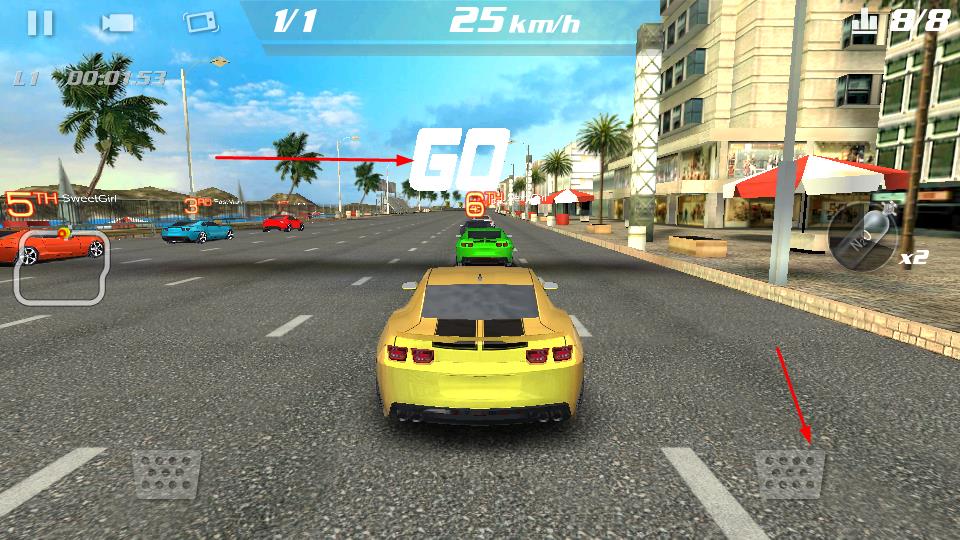 1、比赛启动时,屏幕显示GO后,通过下方按键操控赛车起步,然后去驶入城市赛道开启竞速。
