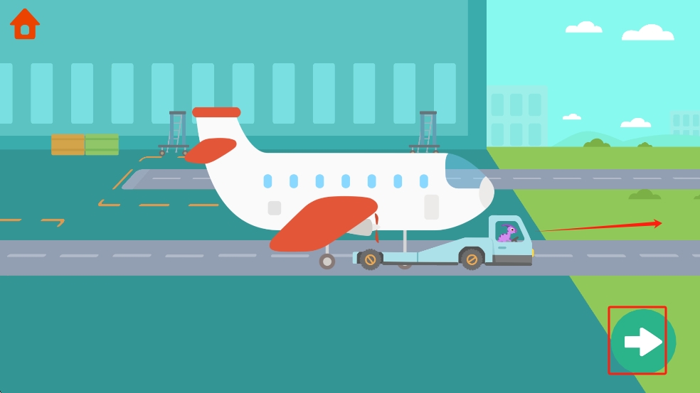 1、进入作品后我们点击右下角绿色箭头按钮,启动拖车牵引飞机,完成机场地面运输环节。