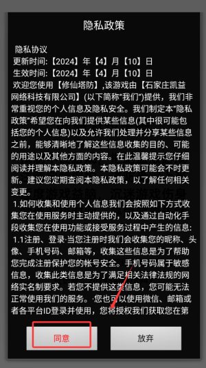 1、首次进入需阅读并确认用户协议,点击同意后方可开启奇幻冒险之旅。