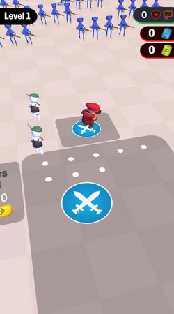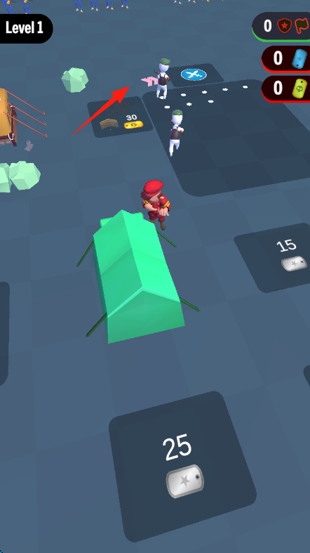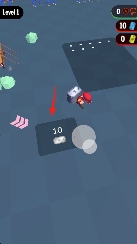 1、关卡1,操控红帽角色,沿红箭头拾取10资源,积累金币、道具,用于合成士兵、升级战力,界面右上角显示资源,可辅助战斗。