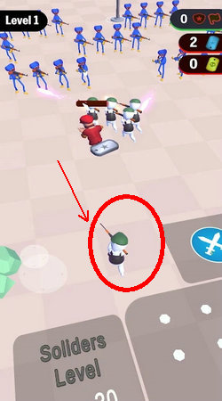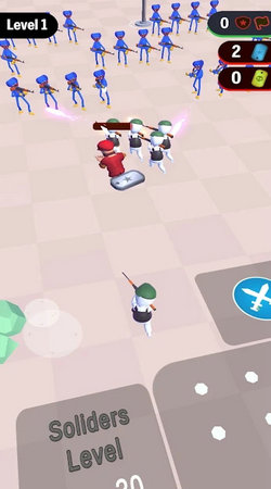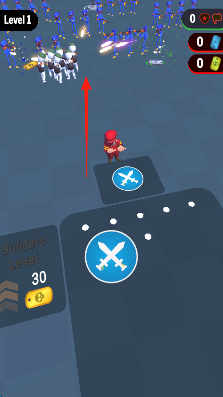 3、战斗阶段,红箭头指引进攻方向,点击飞机交叉剑按钮,指挥合成后的士兵,进攻敌方,消耗敌方血量,击败敌方,完成关卡1。