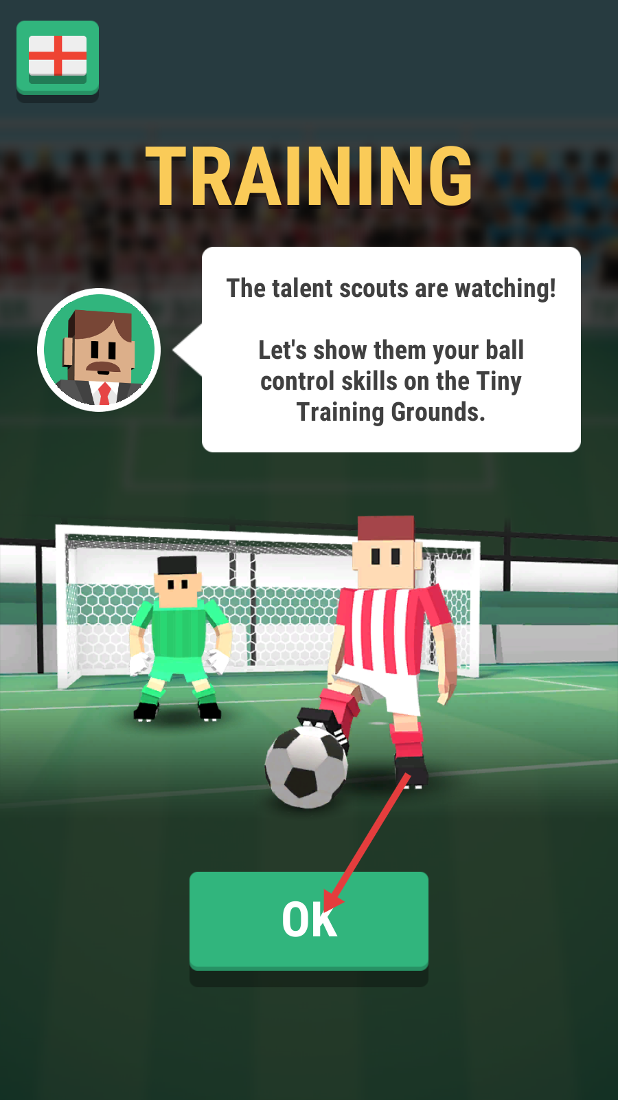 1、训练开启,点击【OK】,于【Tiny-Training-Grounds】展示控球技巧,吸引球探关注,开启训练。