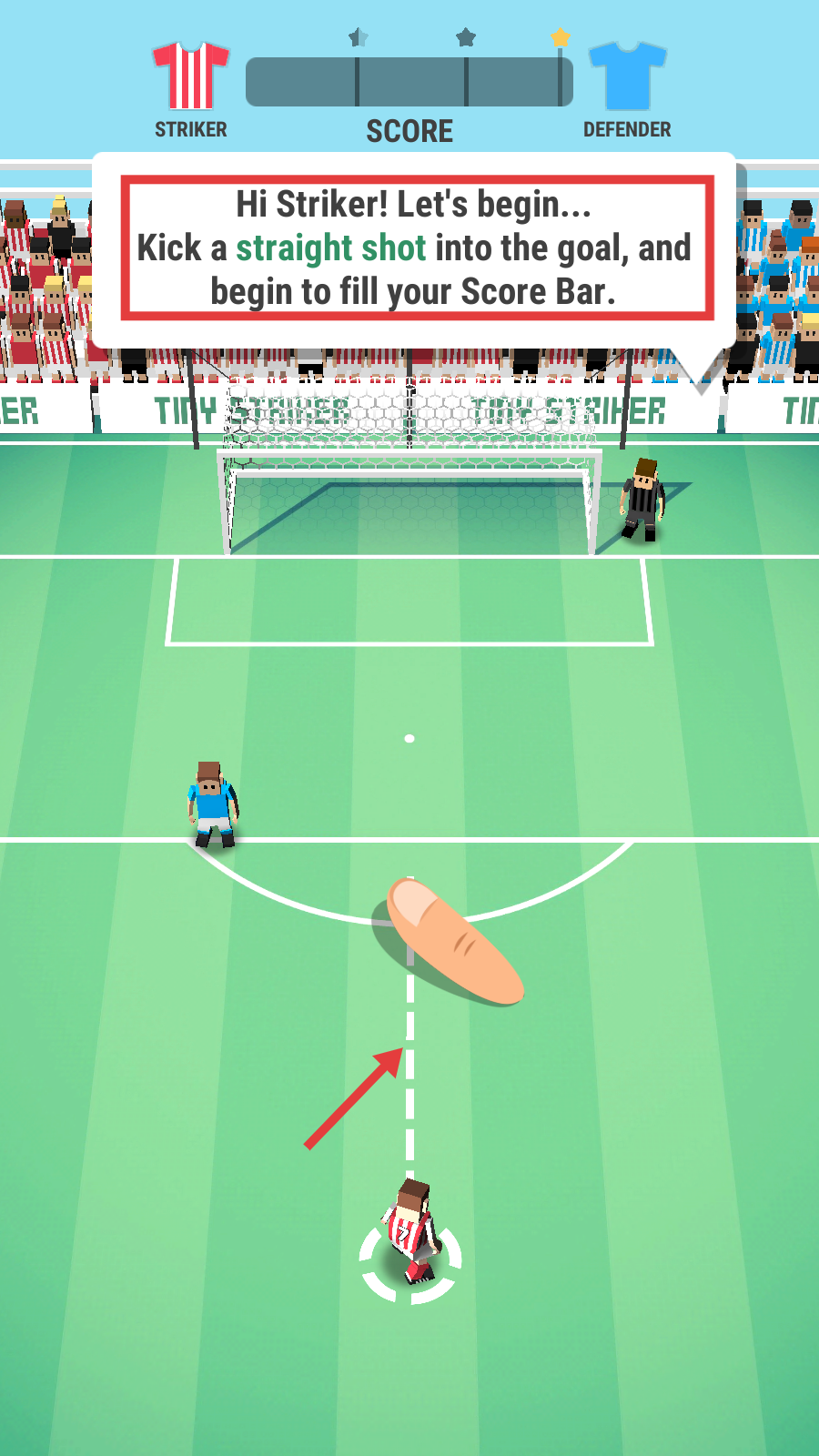 2、跟随指引沿虚线踢直线球入门,完成【straight-shot】,填充【Score-Bar】,积累得分推进赛事。