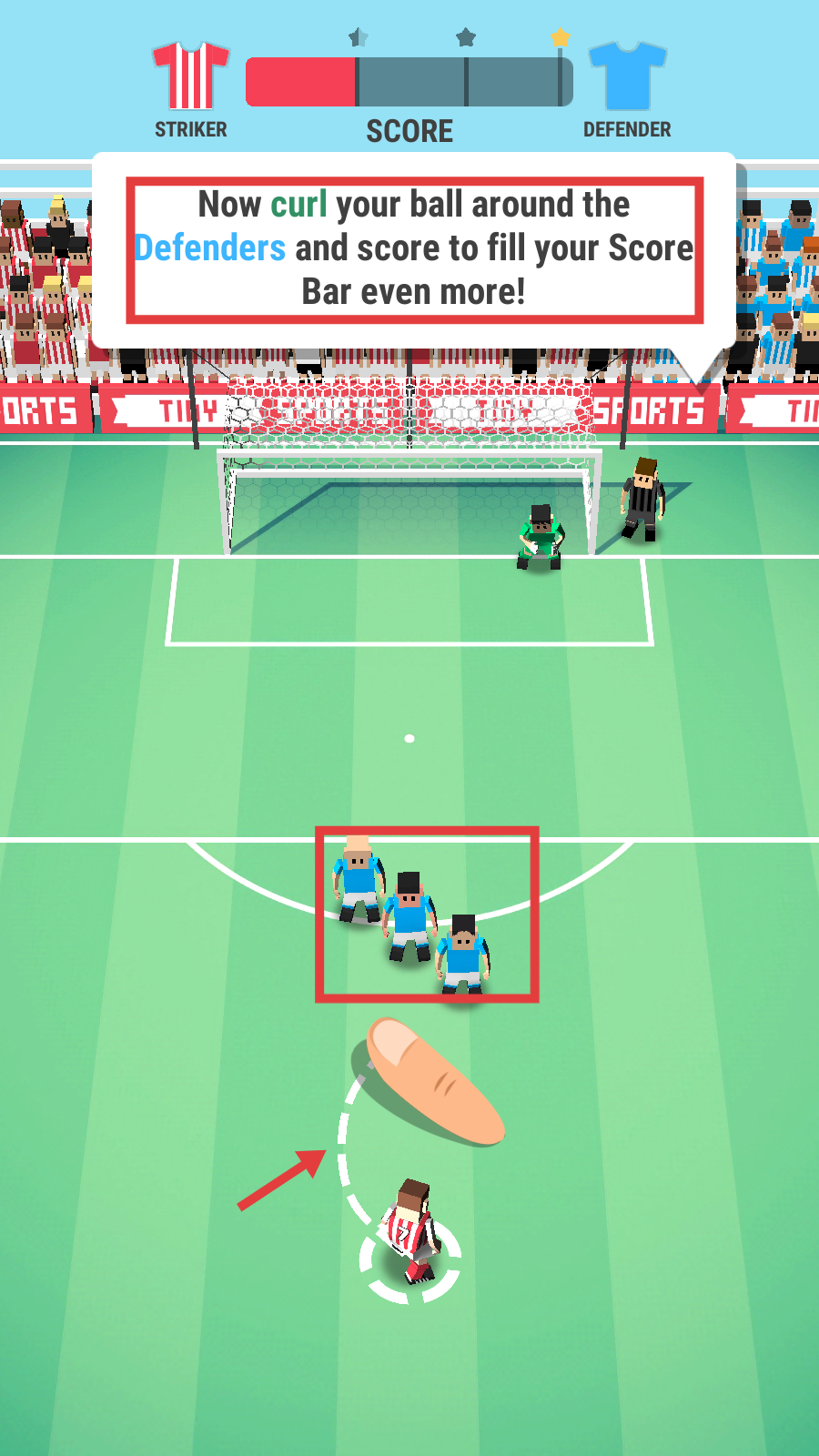 3、遇防守时,踢弧线球绕开【Defenders】精准射门,让【Score-Bar】获更多增长,扩大优势。