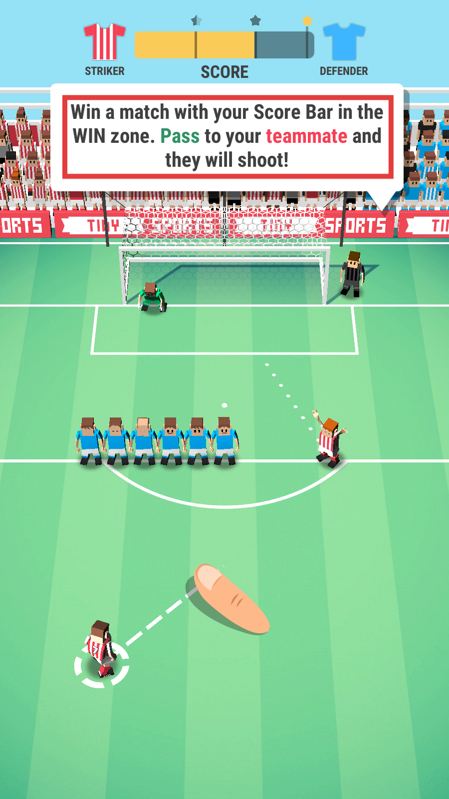 4、使【Score-Bar】入【WIN-zone】,传球给【teammate】,由其射门,助力赢下足球对决。