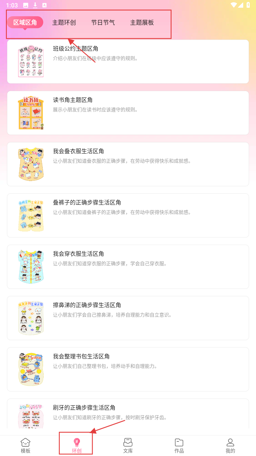 1、进入【环创】页,选【区域区角】,找到【班级公约主题区角】,点击进入找素材。