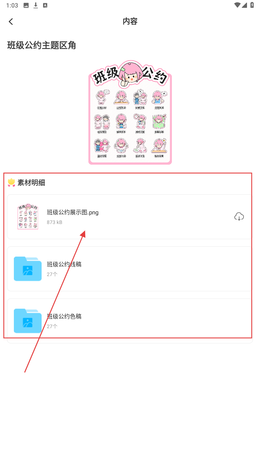 2、在【班级公约主题区角】内容页,查看【素材明细】,按需选【班级公约展示图】。