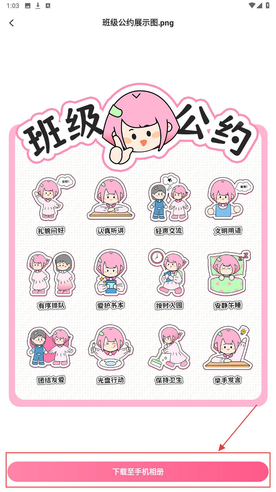 3、打开【班级公约展示图】,点【下载至手机相册】,保存该展示图素材。