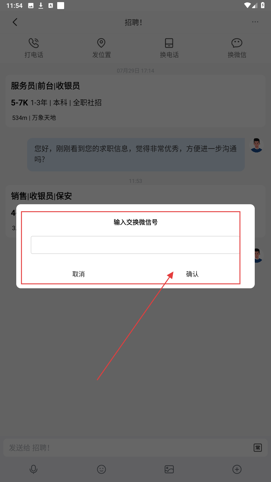 4、点【换微信】后,在弹出框填微信号,点【确认】,完成微信交换申请。