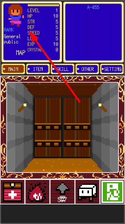 2、进入游戏后,查看角色属性面板,按红色箭头指引,点击MAIN菜单,了解功能,准备探索地牢。
