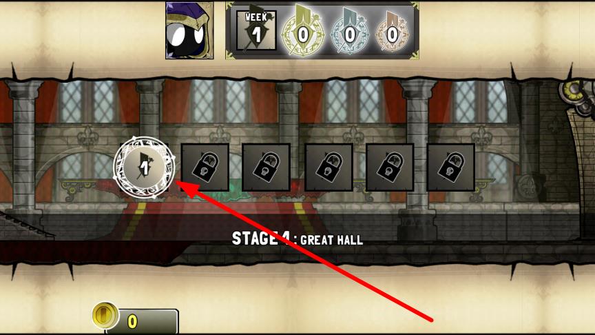 1、在关卡选择界面,点击标有1的圆形图标,进入STAGE1: GREAT HALL关卡,开启城堡大厅的冒险。