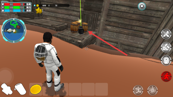 3、抵达目标建筑,靠近木桶旁发光物件,点击互动获取道具或线索,推进生存,解谜任务。