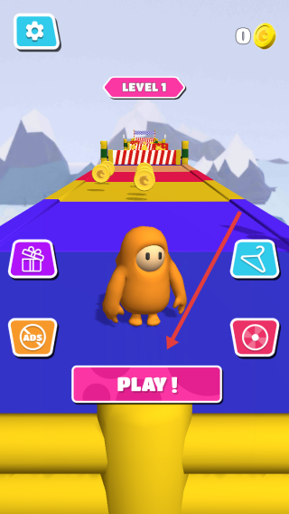 1、在LEVEL1初始界面,点击粉色PLAY按钮,操控橙色角色开启跑道闯关,正式进入第一关冒险。