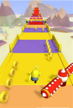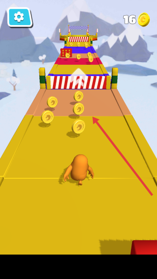 2、沿跑道前行,引导角色躲避障碍,尽可能拾取全部金币,借助跑道上的加速带、跳板等道具。