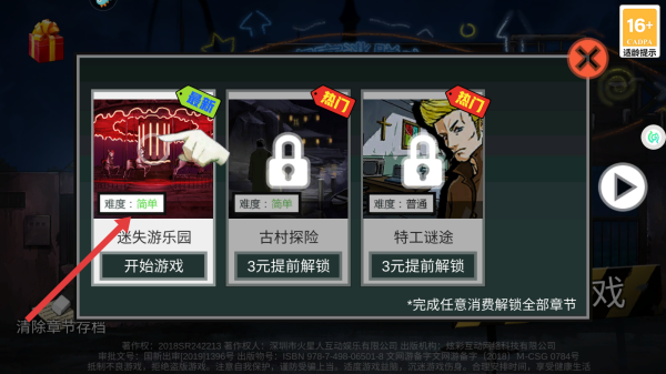 2、在关卡选择界面,点击标有迷失游乐园难度:简单的关卡,再点其下方开始游戏,进入游戏剧情阶段。