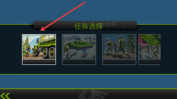 1、在任务选择页,点击首张绿色军车任务卡,确认进入该军事载具关卡,开启作战流程。