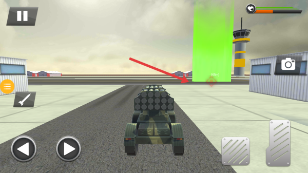 2、操控导弹车时,借左右按键调整行进方向,朝绿色光柱标记的目标区域行驶,避开机场障碍。
