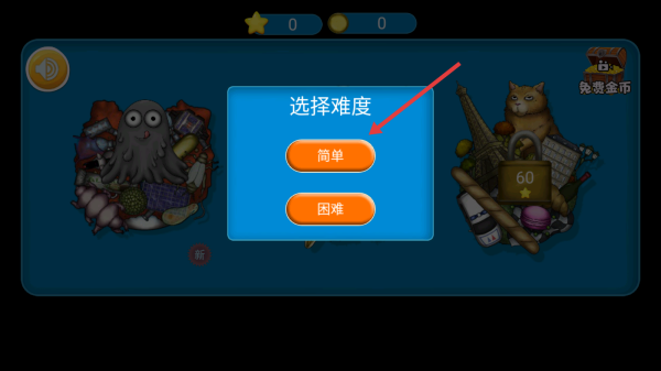 1、点击山体场景下橙色开始游戏按钮,跳转至难度选择界面,开启这款含怪物山体元素的卡通风格游戏,正式进入挑战流程。