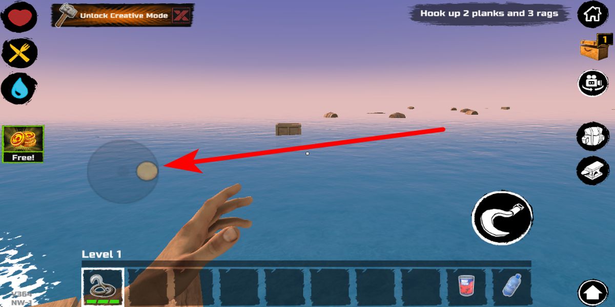 2、操控角色移动,进入游戏场景后,点击屏幕左下方的虚拟方向键,灵活控制角色视角在木筏上移动,便更好地进行后续各项操作。