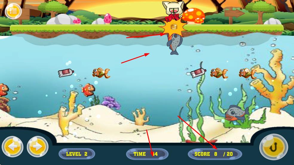 3、钓取更大鱼类,应对水下垃圾障碍,持续积累分数推进关卡,提升游戏成果。