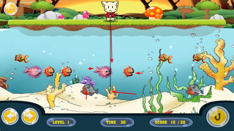 1、操控猫咪角色在岸边准备,通过左右箭头按钮调整位置,点击鱼钩按钮下钩。