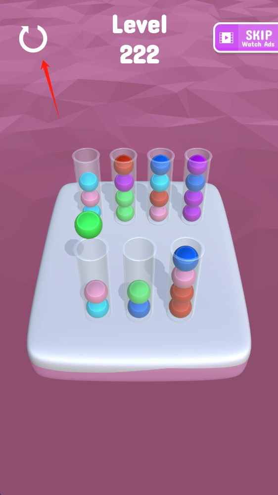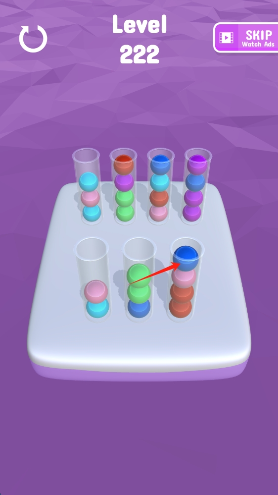 2、游戏中,通过点击不同试管,将相同颜色的球移动到同一试管中,完成颜色分类。