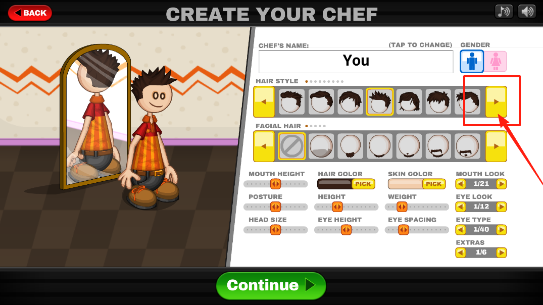 3、在创建厨师界面切换性别为女性后,发型和刘海选项更新,点对应样式选喜欢的发型和刘海,也能用箭头翻看更多选项,调整好这些最后点Continue完成厨师创建。